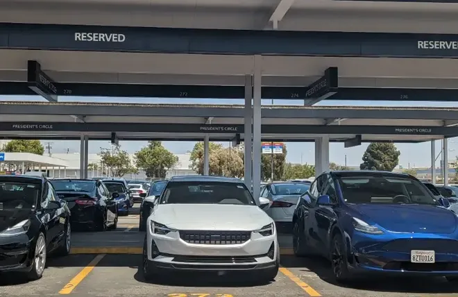 I walked through the three rows of cars, looking for a hybrid vehicle. This was California, the land where gas prices were exceeding $7. Our plans had us driving 130 miles to our destination in the San Jacinto mountains, and a hybrid car would help us stretch every gas dollar. As I walked I noticed several rows of Tesla Model 3s and Model Ys, which jogged my memory of Hertz electrifying its fleet. After not finding any hybrid vehicles on the lot, Kenny started searching for which car, in the three rows of "Presidential Circle" vehicles had the best gas mileage, while I walked back over to Karen for some help.